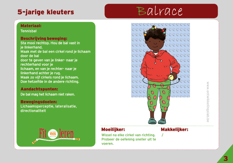 Je zoekt achter een klein balletje (vb. tennisbal,...). Heb je dit niet bij de hand kan je ook van een blad papier een bolletje maken. Wie kan er als eerste 5 cirkels rond het lichaam maken? Lukt dit, probeer het dan ook rond je been. Veel succes !!!